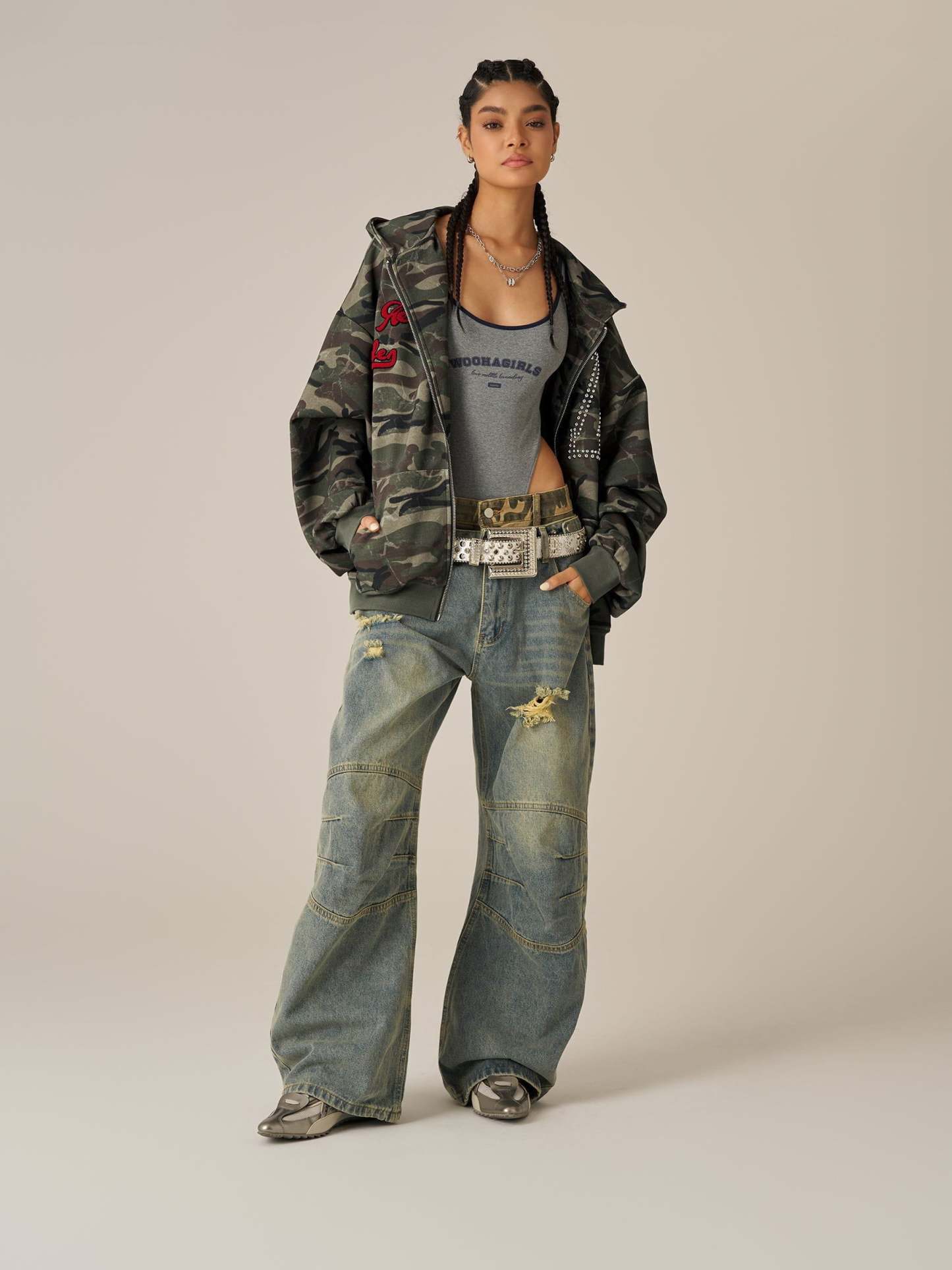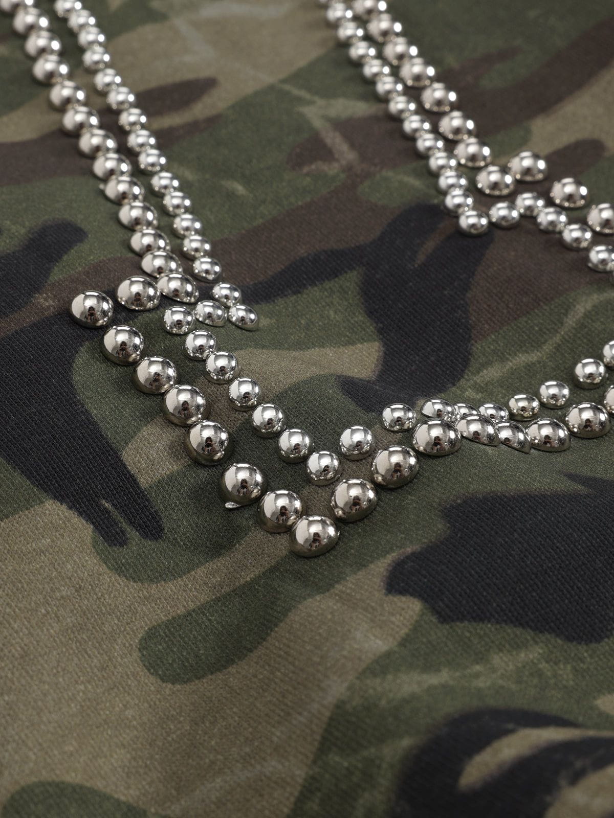 Featuring an all-over camouflage, this piece brings edge and attitude to your everyday rotation. The standout back design showcases a striking "77" made from metal studs, giving it a rugged, statement finish. A detailed embroidered brand logo sits on the chest for a touch of authenticity.